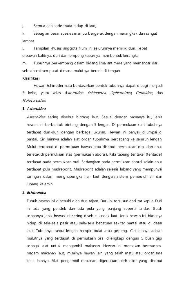 dollar), Crinoidea (lili laut dan bintang bulu), dan Holothuroidea (timun